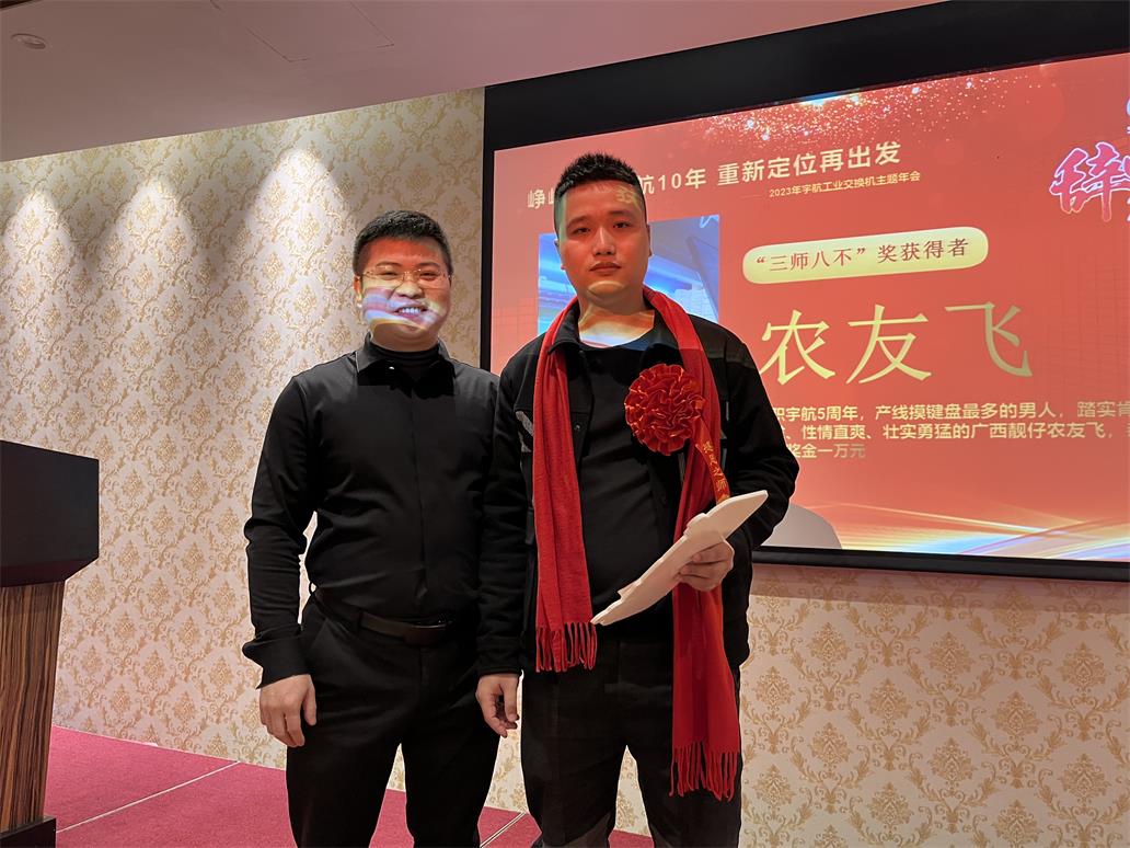 農友飛—入職宇航五周年獎,獎勵現金一萬元。這是產線摸鍵盤最多的同事,只要有訂單下來,就認認真真的打好標簽,踏實肯干、心細如發、性情直爽、壯實勇猛的廣西靚仔。