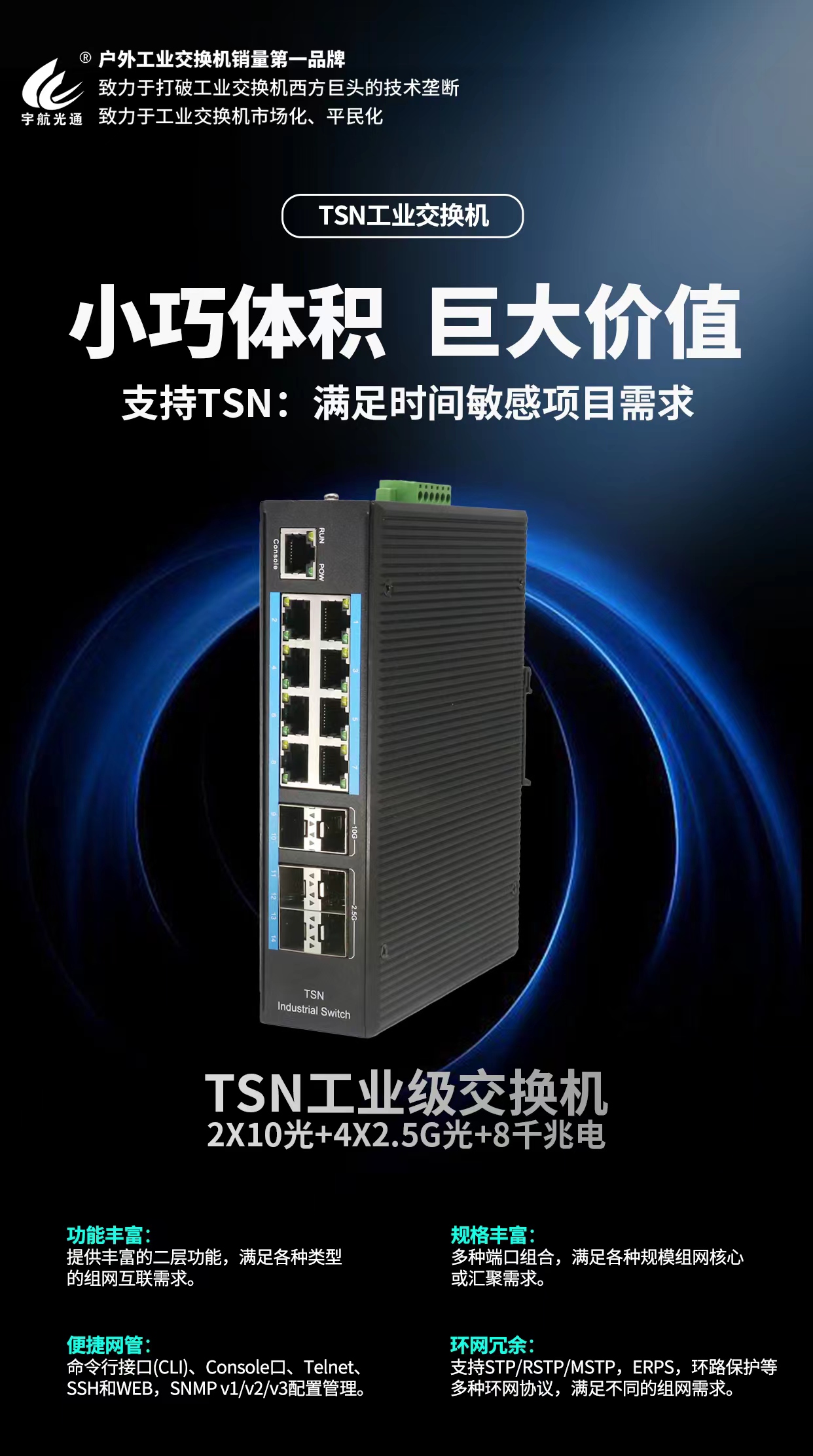 近期,宇航工業(yè)交換機(jī)推出了全國(guó)產(chǎn)工業(yè)交換機(jī),引發(fā)了行業(yè)的廣泛關(guān)注與熱烈討論,各大媒體紛紛爭(zhēng)相報(bào)道這一重大消息。與此同時(shí),宇航工業(yè)交換機(jī)還推出了多款新產(chǎn)品,這些產(chǎn)品各具特色,均以其卓越的性能、穩(wěn)定的質(zhì)量和出色的表現(xiàn),成為了市場(chǎng)上的亮點(diǎn)。今天,將為大家詳細(xì)介紹這幾款新產(chǎn)品,讓我們一同領(lǐng)略宇航工業(yè)交換機(jī)的獨(dú)特魅力與卓越實(shí)力。
