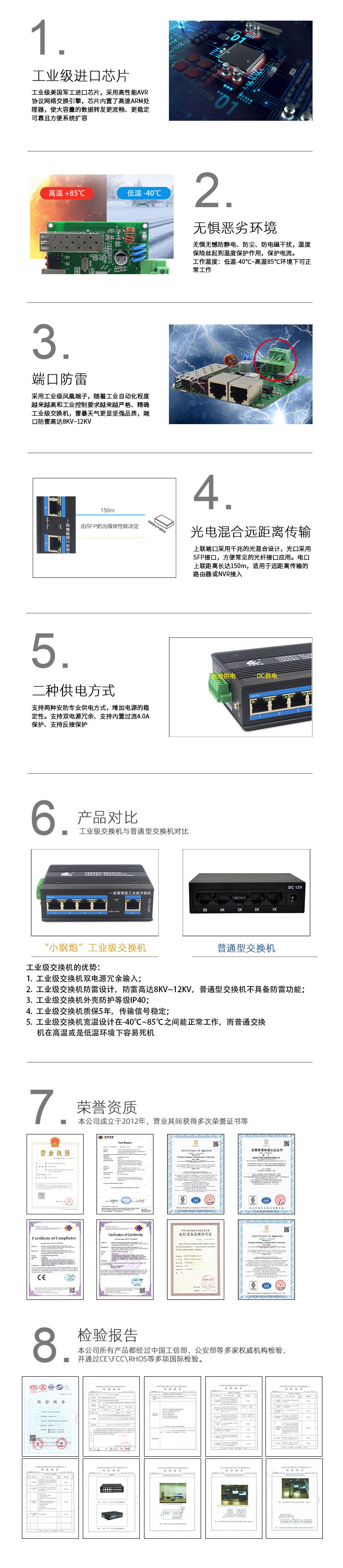 1個百兆光+1個百兆電、SC接口、多模雙纖、2公里、導軌式、DC12-52V供電-寬溫(-40℃-85℃)-CE-RoHS-FCC-公安部檢驗報告-工信部入網許可證 |
