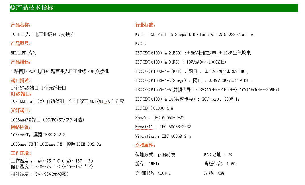 1路百兆POE電口+1路百兆SFP光口工業級以太網POE交換機,支持1個10/100Base-TX電口和1個100Base-X光口。產品符合FCC、CE、ROHS標準。RD11FP系列交換機具有-40℃~80℃的工作溫度,具有超強的堅固度能適應各種嚴苛環境,也可以非常方便的安置在空間緊湊的控制箱中。導軌的安裝特性、寬溫操作及擁有IP40防護等級的外殼及LED指示燈,使RD11FP成為一個即插即用的工業級設備,為用戶的以太網設備聯網提供可靠、便捷的解決方案。
