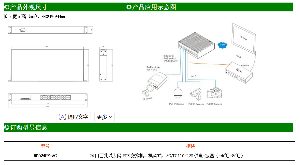 24路百兆電口工業級以太網交換機,支持24個10Base-T/100Base-TX電口。產品符合FCC、CE、ROHS標準。RD024F交換機具有-40℃~80℃的工作溫度,具有超強的堅固度能適應各種嚴苛環境,也可以非常方便的安置在空間緊湊的控制箱中。導軌的安裝特性、寬溫操作及擁有IP40防護等級的外殼及LED指示燈,使RD024F成為一個即插即用的工業級設備,為用戶的以太網設備聯網提供可靠、便捷的解決方案。