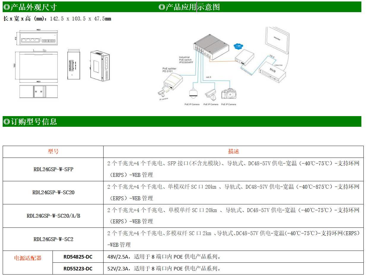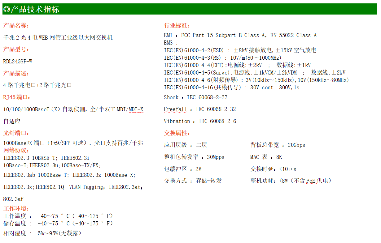 RDL24GSP-W-SC20AB系列WEB管理工業(yè)級(jí)以太網(wǎng)PoE交換機(jī),產(chǎn)品符合FCC、CE、ROHS標(biāo)準(zhǔn),支持工業(yè)現(xiàn)場(chǎng)所需的以太網(wǎng)二層協(xié)議,保證通信網(wǎng)絡(luò)的穩(wěn)定性。該系列交換機(jī)采用低功耗、無(wú)風(fēng)扇設(shè)計(jì),確保無(wú)噪聲干擾,同時(shí)支持-40~75℃工作溫度和良好的EMC電磁兼容性能,保證在惡劣的工業(yè)環(huán)境中保持穩(wěn)定的工作,為工廠自動(dòng)化,智能交通,視頻監(jiān)控等工業(yè)應(yīng)用領(lǐng)域組建快速穩(wěn)定的網(wǎng)絡(luò)終端接入網(wǎng)絡(luò)提供安全可靠的解決方案。