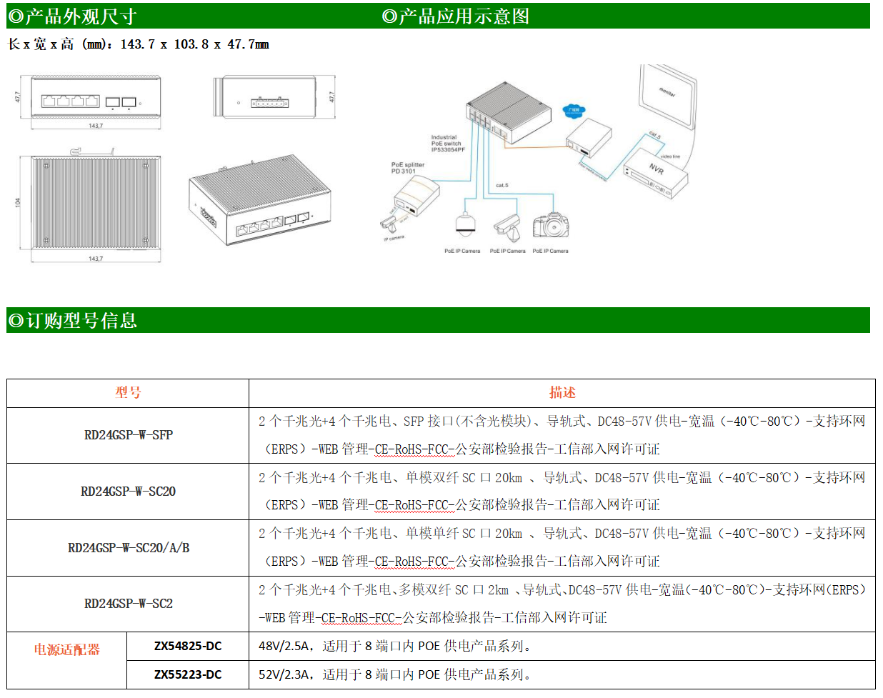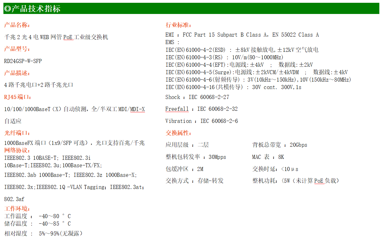 RD24GSP-W系列WEB管理工業(yè)級以太網(wǎng)PoE交換機(jī),產(chǎn)品符合FCC、CE、ROHS標(biāo)準(zhǔn),支持工業(yè)現(xiàn)場所需的以太網(wǎng)二層協(xié)議,保證通信網(wǎng)絡(luò)的穩(wěn)定性。該系列交換機(jī)采用低功耗、無風(fēng)扇設(shè)計(jì),確保無噪聲干擾,同時(shí)支持-40~80℃工作溫度和良好的EMC電磁兼容性能,保證在惡劣的工業(yè)環(huán)境中保持穩(wěn)定的工作,為工廠自動(dòng)化,智能交通,視頻監(jiān)控等工業(yè)應(yīng)用領(lǐng)域組建快速穩(wěn)定的網(wǎng)絡(luò)終端接入網(wǎng)絡(luò)提供安全可靠的解決方案。