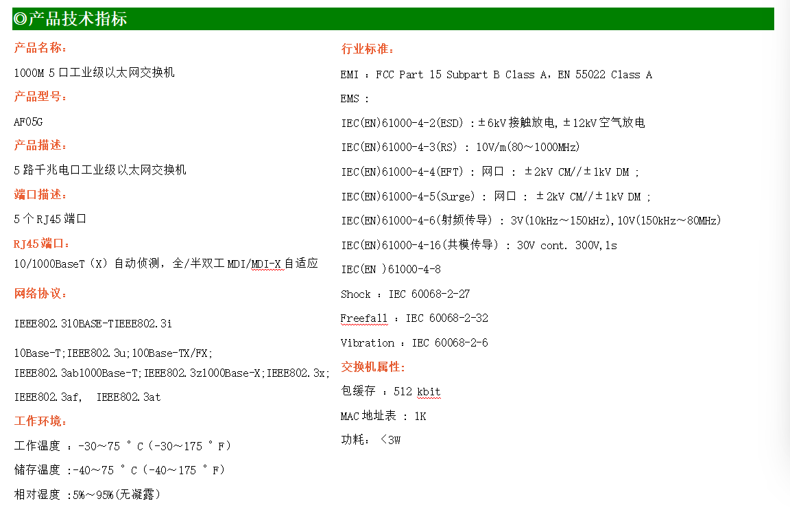 5路千兆電口工業(yè)級以太網(wǎng)交換機(jī),支持5個(gè)10Base-T/100Base-TX/1000Base-TX電口。產(chǎn)品符合FCC、CE、ROHS標(biāo)準(zhǔn)。AF05G交換機(jī)具有-30℃~75℃的工作溫度,具有超強(qiáng)的堅(jiān)固度能適應(yīng)各種嚴(yán)苛環(huán)境,也可以非常方便的安置在空間緊湊的控制箱中。導(dǎo)軌的安裝特性、寬溫操作及擁有IP40防護(hù)等級的外殼及LED指示燈,使AF05G成為一個(gè)即插即用的工業(yè)級設(shè)備,為用戶的以太網(wǎng)設(shè)備聯(lián)網(wǎng)提供可靠、便捷的解決方案。