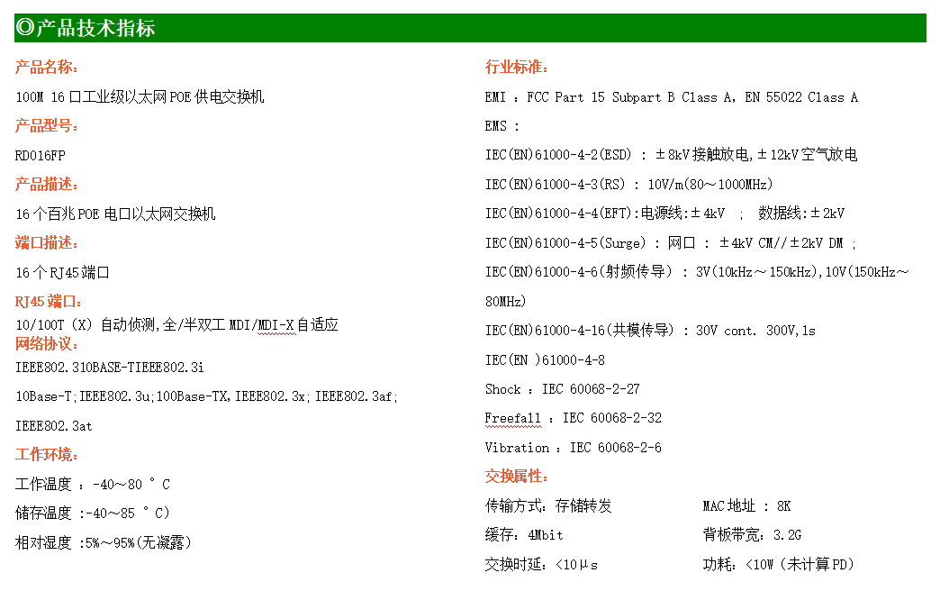 16路百兆電口工業級以太網交換機,支持16個10Base-T/100Base-TX POE電口。產品符合FCC、CE、ROHS標準。ZXR016FP交換機具有-40℃~80℃的工作溫度,具有超強的堅固度能適應各種嚴苛環境,也可以非常方便的安置在空間緊湊的控制箱中。導軌的安裝特性、寬溫操作及擁有IP40防護等級的外殼及LED指示燈,使ZXR016FP成為一個即插即用的工業級設備,為用戶的以太網設備聯網提供可靠、便捷的解決方案。