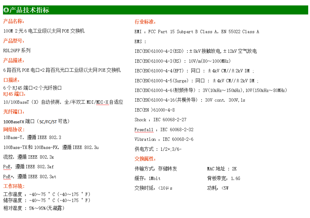 6路百兆POE電口+2路百兆FX光口工業(yè)級以太網(wǎng)交換機,支持6個10Base-T/100Base-TX電口和2個100Base-X光口。產(chǎn)品符合FCC、CE、ROHS標準。RDL26FP系列交換機具有-40℃~75℃的工作溫度,具有超強的堅固度能適應各種嚴苛環(huán)境,也可以非常方便的安置在空間緊湊的控制箱中。導軌的安裝特性、寬溫操作及擁有IP40防護等級的外殼及LED指示燈,使RDL26FP成為一個即插即用的工業(yè)級設(shè)備,為用戶的以太網(wǎng)設(shè)備聯(lián)網(wǎng)提供可靠、便捷的解決方案。