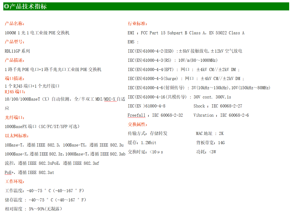 1路千兆POE電口+1路千兆FX光口工業級以太網POE交換機,支持1個10/100Base-TX電口和1個100Base-X光口。產品符合FCC、CE、ROHS標準。RDL11GP系列交換機具有-40℃~75℃的工作溫度,具有超強的堅固度能適應各種嚴苛環境,也可以非常方便的安置在空間緊湊的控制箱中。導軌的安裝特性、寬溫操作及擁有IP40防護等級的外殼及LED指示燈,使RDL11GP成為一個即插即用的工業級設備,為用戶的以太網設備聯網提供可靠、便捷的解決方案。