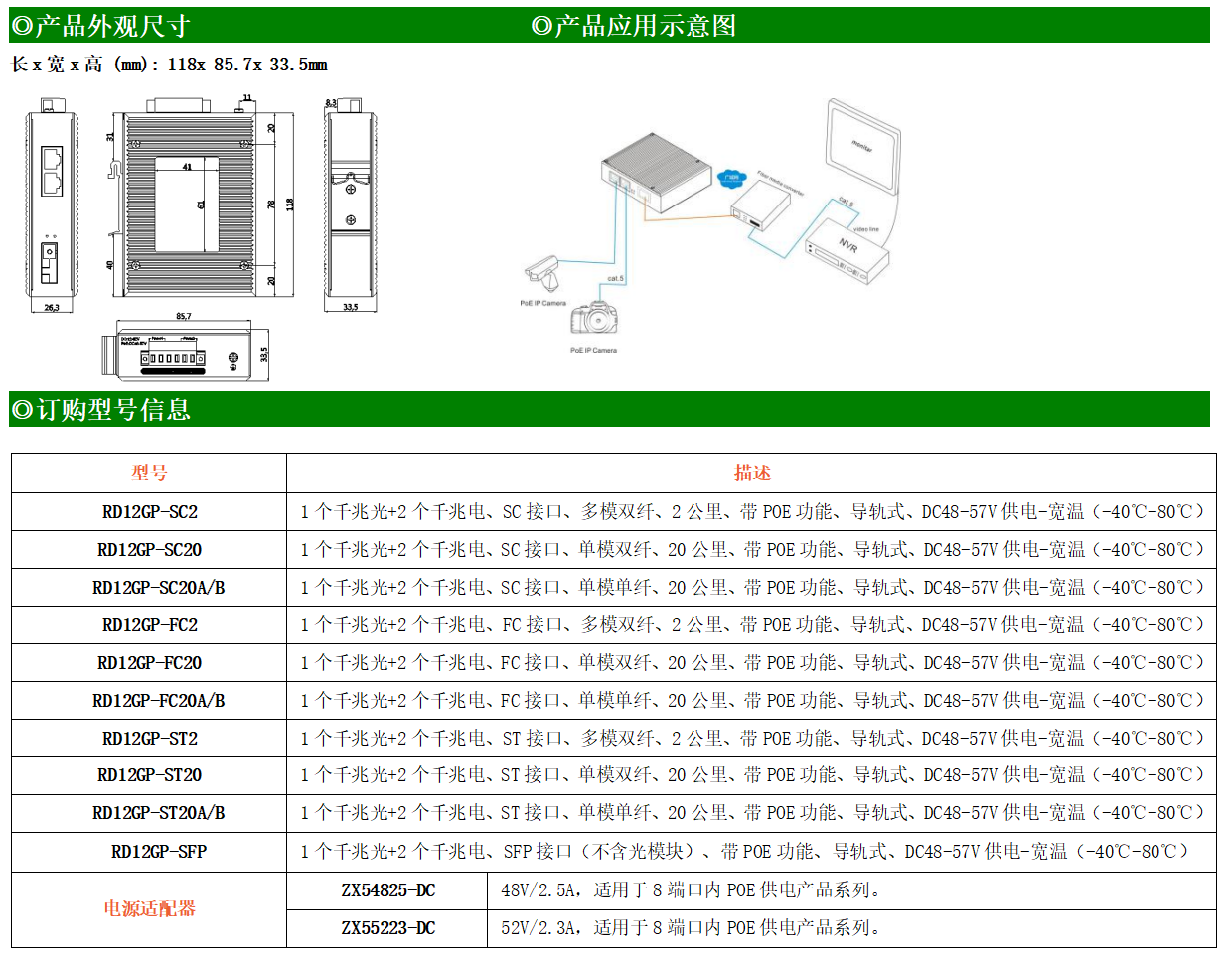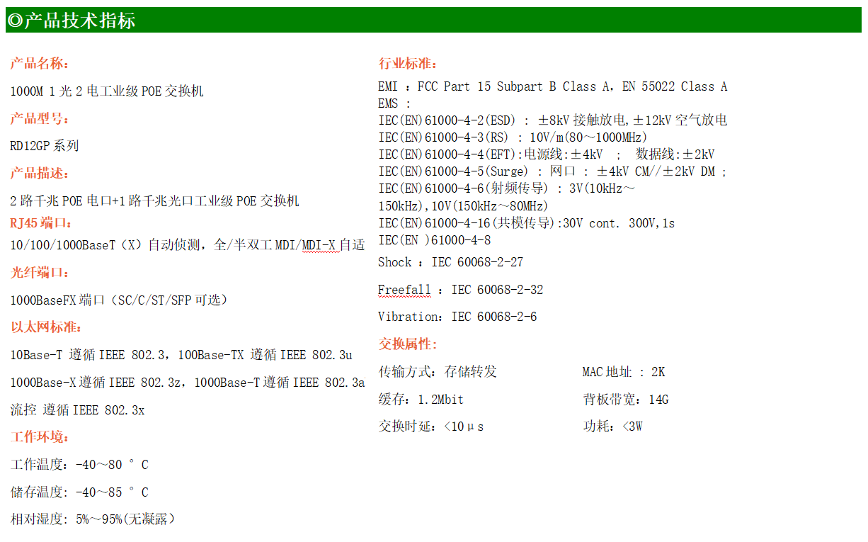 2路千兆POE電口+1路千兆FX光口工業(yè)級(jí)以太網(wǎng)POE交換機(jī),支持2個(gè)10/100/1000Base-TX電口和1個(gè)1000Base-X光口。產(chǎn)品符合FCC、CE、ROHS標(biāo)準(zhǔn)。RD12GP系列交換機(jī)具有-40℃~80℃的工作溫度,具有超強(qiáng)的堅(jiān)固度能適應(yīng)各種嚴(yán)苛環(huán)境,也可以非常方便的安置在空間緊湊的控制箱中。導(dǎo)軌的安裝特性、寬溫操作及擁有IP40防護(hù)等級(jí)的外殼及LED指示燈,使RD12GP成為一個(gè)即插即用的工業(yè)級(jí)設(shè)備,為用戶(hù)的以太網(wǎng)設(shè)備聯(lián)網(wǎng)提供可靠、便捷的解決方案。