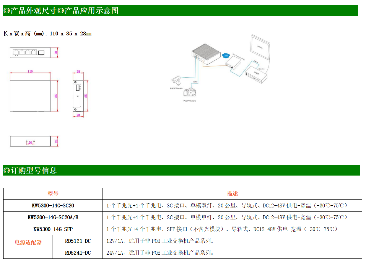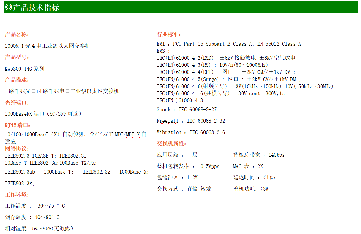 4路千兆電口+1路千兆FX光口工業級以太網交換機,支持4個100Base-T/1000Base-TX電口和1個1000Base-X光口。產品符合FCC、CE、ROHS標準。KW5300-14G系列交換機具有-30℃~75℃的工作溫度,具有超強的堅固度能適應各種嚴苛環境,也可以非常方便的安置在空間緊湊的控制箱中。導軌的安裝特性、寬溫操作及擁有IP40防護等級的外殼及LED指示燈,使AF14G成為一個即插即用的工業級設備,為用戶的以太網設備聯網提供可靠、便捷的解決方案。