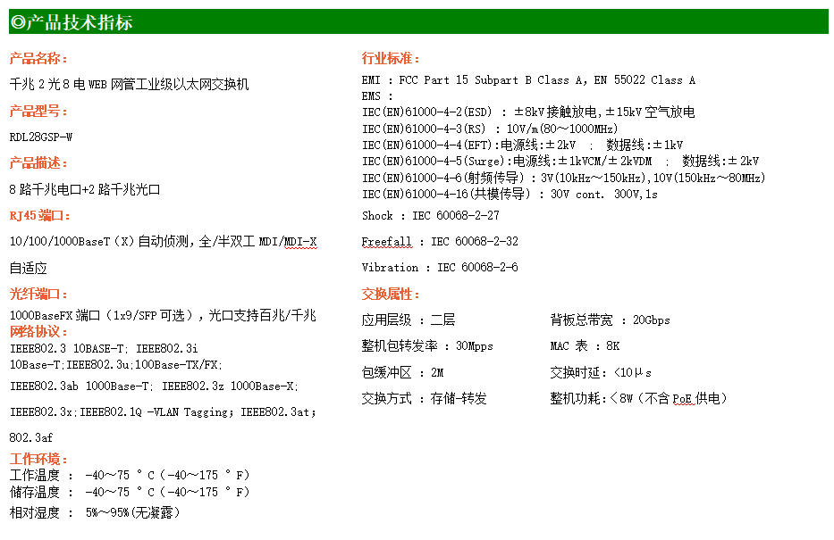 RDL28GS-W-SFP系列WEB網(wǎng)管工業(yè)級以太網(wǎng)交換機,產(chǎn)品符合FCC、CE、ROHS標準,支持工業(yè)現(xiàn)場所需的以太網(wǎng)二層協(xié)議,保證通信網(wǎng)絡的穩(wěn)定性。該系列交換機采用低功耗、無風扇設計,確保無噪聲干擾,同時支持-40~75℃工作溫度和良好的EMC電磁兼容性能,保證在惡劣的工業(yè)環(huán)境中保持穩(wěn)定的工作,為工廠自動化,智能交通,視頻監(jiān)控等工業(yè)應用領域組建快速穩(wěn)定的網(wǎng)絡終端接入網(wǎng)絡提供安全可靠的解決方案。