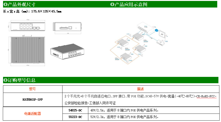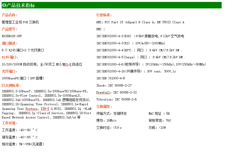 RD28BGSP-SFP是網管型工業級以太網POE交換機,產品符合FCC、CE、ROHS標準。支持2個千兆光口和8個千兆POE電口,支持一路console口;支持工業現場所需的以太網二層協議,保證通信網絡的穩定性;該系列交換機采用低功耗、無風扇設計,確保無噪聲干擾,同時支持-40~80℃工作溫度和良好的EMC電磁兼容性能,保證在惡劣的工業環境中保持穩定的工作,為工廠自動化,智能交通,視頻監控等工業應用領域組建快速穩定的網絡終端接入網絡提供安全可靠的解決方案。