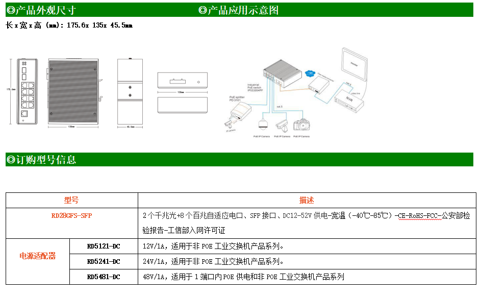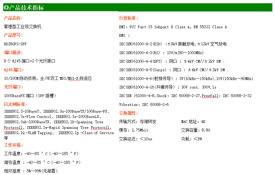 RD28GFS-SFP是網(wǎng)管型工業(yè)以太網(wǎng)交換機(jī),產(chǎn)品符合FCC、CE、ROHS標(biāo)準(zhǔn)。支持2個(gè)千兆光口和8個(gè)百兆電口,支持一路console口;支持工業(yè)現(xiàn)場(chǎng)所需的以太網(wǎng)二層協(xié)議,保證通信網(wǎng)絡(luò)的穩(wěn)定性;該系列交換機(jī)采用低功耗、無(wú)風(fēng)扇設(shè)計(jì),確保無(wú)噪聲干擾,同時(shí)支持-40~85℃工作溫度和良好的EMC電磁兼容性能,保證在惡劣的工業(yè)環(huán)境中保持穩(wěn)定的工作,為工廠自動(dòng)化,智能交通,視頻監(jiān)控等工業(yè)應(yīng)用領(lǐng)域組建快速穩(wěn)定的網(wǎng)絡(luò)終端接入網(wǎng)絡(luò)提供安全可靠的解決方案。