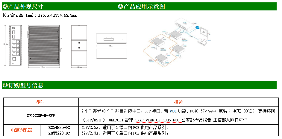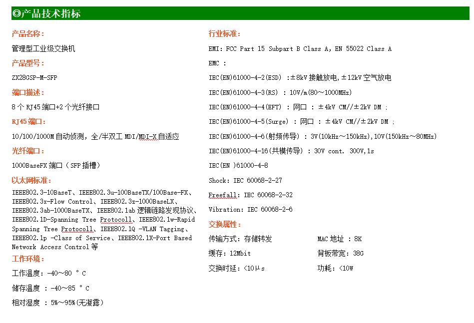 ZX28GSP-M是網(wǎng)管型工業(yè)以太網(wǎng)POE交換機,產(chǎn)品符合FCC、CE、RoHS標準。支持2個千兆光口和8個千兆電口;支持工業(yè)現(xiàn)場所需的以太網(wǎng)二層協(xié)議,保證通信網(wǎng)絡(luò)的穩(wěn)定性;該系列交換機采用低功耗、無風扇設(shè)計,確保無噪聲干擾,同時支持-40~80℃工作溫度和良好的EMC電磁兼容性能,保證在惡劣的工業(yè)環(huán)境中保持穩(wěn)定的工作,為工廠自動化,智能交通,視頻監(jiān)控等工業(yè)應用領(lǐng)域組建快速穩(wěn)定的網(wǎng)絡(luò)終端接入網(wǎng)絡(luò)提供安全可靠的解決方案。