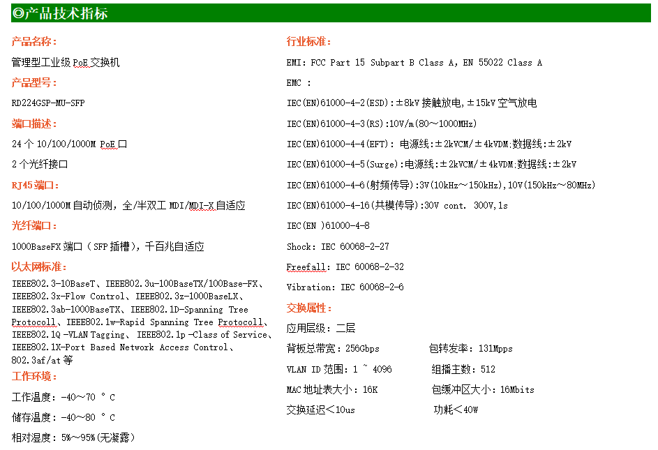 RD224GSP-MU-SFP是網(wǎng)管型工業(yè)以太網(wǎng)PoE交換機(jī),產(chǎn)品符合FCC、CE、RoHS標(biāo)準(zhǔn)。可提供24個(gè)千兆PoE端口,所有PoE端口符合IEEE802.3af/at標(biāo)準(zhǔn)。支持工業(yè)現(xiàn)場(chǎng)所需的以太網(wǎng)二層協(xié)議,保證通信網(wǎng)絡(luò)的穩(wěn)定性;該系列交換機(jī)采用低功耗、無(wú)風(fēng)扇設(shè)計(jì),確保無(wú)噪聲干擾,同時(shí)支持-40~70℃工作溫度和良好的EMC電磁兼容性能,保證在惡劣的工業(yè)環(huán)境中保持穩(wěn)定的工作,為工廠自動(dòng)化,智能交通,視頻監(jiān)控等工業(yè)應(yīng)用領(lǐng)域組建快速穩(wěn)定的網(wǎng)絡(luò)終端接入網(wǎng)絡(luò)提供安全可靠的解決方案。