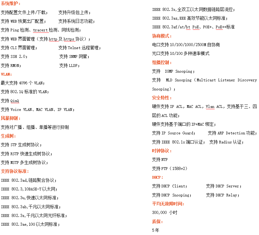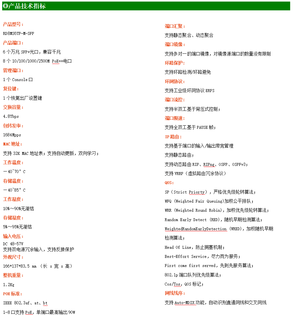 ●網(wǎng)絡(luò)冗余:支持STP/RSTP/MSTP,支持ERPS(自愈時(shí)間<20ms)