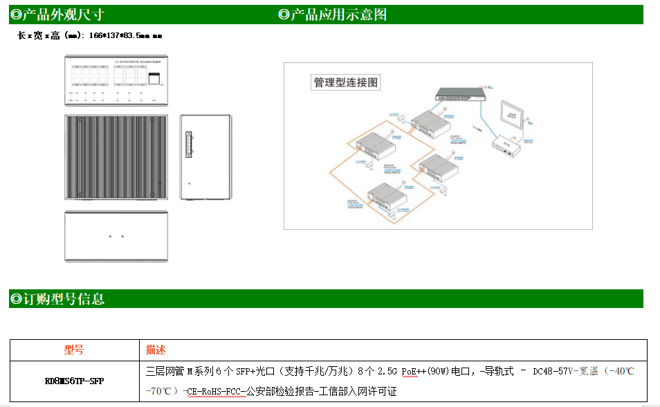RD8MS6TP-SFP交換機(jī)是我司推出的一款萬兆三層工業(yè)以太網(wǎng)交換機(jī),產(chǎn)品符合FCC、CE、RoHS標(biāo)準(zhǔn)。可提供8個(gè)2.5G PoE端口,所有PoE端口符合IEEE802.3af/at/bt標(biāo)準(zhǔn)。具備先進(jìn)的硬件處理能力和最豐富的業(yè)務(wù)特性。支持IPv4/IPv6 硬件雙棧及線速轉(zhuǎn)發(fā),使客戶能夠從容應(yīng)對(duì)即將帶來的IPv6 時(shí)代其提供高容量的交換能力。RD8MS6TP-SFP交換機(jī)具有-40℃~70℃的工作溫度,具有超強(qiáng)的堅(jiān)固度能適應(yīng)各種嚴(yán)苛環(huán)境。導(dǎo)軌式安裝特性、寬溫操作,使RD8MS6TP-SFP的交換機(jī)成為一個(gè)即插即用的工業(yè)級(jí)設(shè)備,為用戶的以太網(wǎng)設(shè)備聯(lián)網(wǎng)提供可靠、便捷的解決方案。