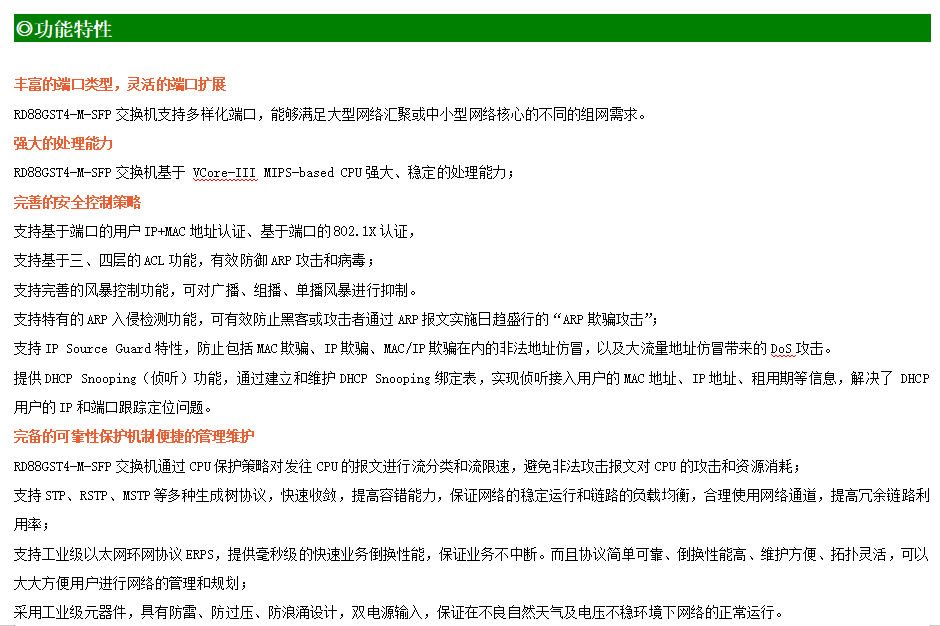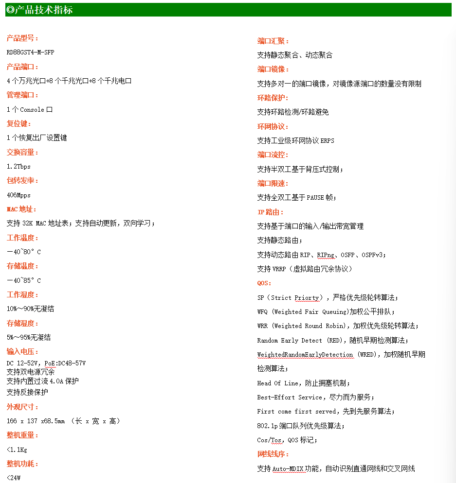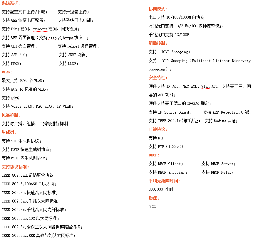 ●網(wǎng)絡(luò)冗余:支持STP/RSTP/MSTP,支持ERPS(自愈時(shí)間<20ms)