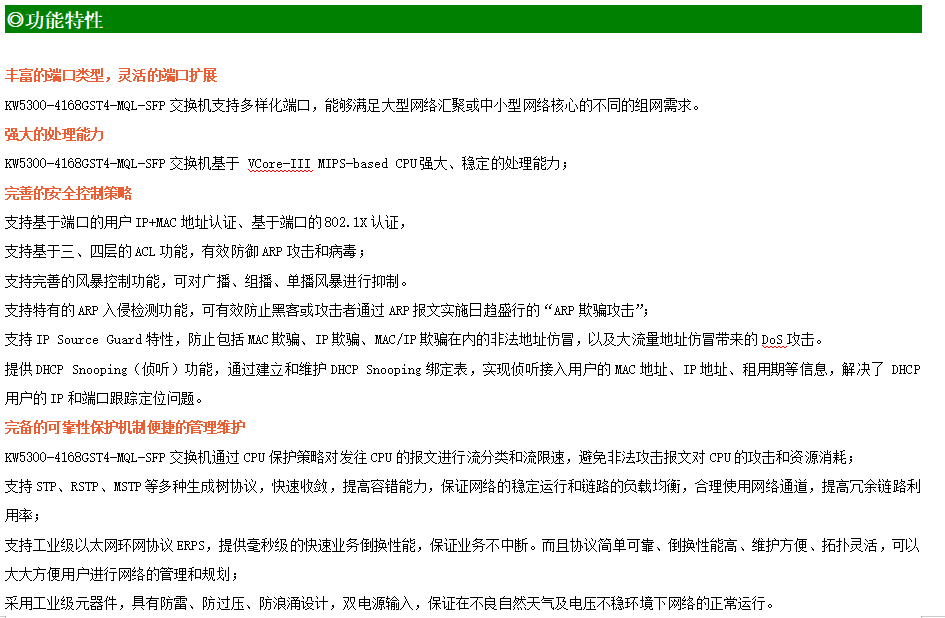 KW5300-4168GST4-MQL-SFP交換機是我司推出的一款萬兆三層交換機,配備4個萬兆SFP+光口、16個千兆SFP光口和8個10/100/1000M Base-T自適應電口,具備先進的硬件處理能力和最豐富的業務特性。支持IPv4/IPv6 硬件雙棧及線速轉發,使客戶能夠從容應對即將帶來的IPv6 時代其提供高容量的交換能力。KW5300-4168GST4-MQL-SFP交換機具有-30℃-70℃的工作溫度,具有超強的堅固度能適應各種嚴苛環境。導軌式安裝特性、寬溫操作,使KW5300-4168GST4-MQL-SFP的交換機成為一個即插即用的工業級設備,為用戶的以太網設備聯網提供可靠、便捷的解決方案。