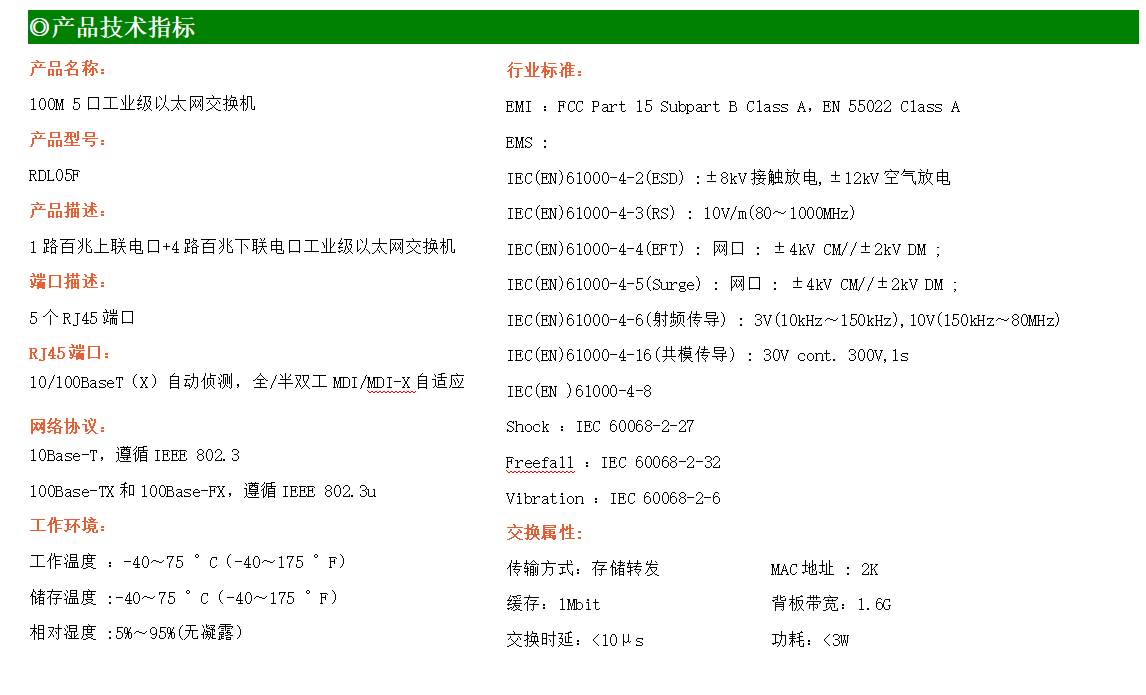 1路百兆上聯電口+4路百兆下聯電口工業級以太網交換機,支持1個10/100Base-TX上聯電口和4個10Base-T/100Base-TX下聯電口。產品符合FCC、CE、ROHS標準。RDL05F交換機具有-40℃~75℃的工作溫度,具有超強的堅固度能適應各種嚴苛環境,也可以非常方便的安置在空間緊湊的控制箱中。導軌的安裝特性、寬溫操作及擁有IP40防護等級的外殼及LED指示燈,使RDL05F成為一個即插即用的工業級設備,為用戶的以太網設備聯網提供可靠、便捷的解決方案。