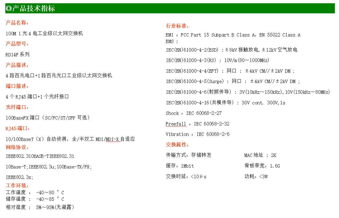 4路百兆電口+1路百兆FX光口工業級以太網交換機,支持4個10Base-T/100Base-TX電口和1個100Base-X光口。產品符合FCC、CE、ROHS標準。RD14F系列交換機具有-40℃~80℃的工作溫度,具有超強的堅固度能適應各種嚴苛環境,也可以非常方便的安置在空間緊湊的控制箱中。導軌的安裝特性、寬溫操作及擁有IP40防護等級的外殼及LED指示燈,使RD14F成為一個即插即用的工業級設備,為用戶的以太網設備聯網提供可靠、便捷的解決方案。