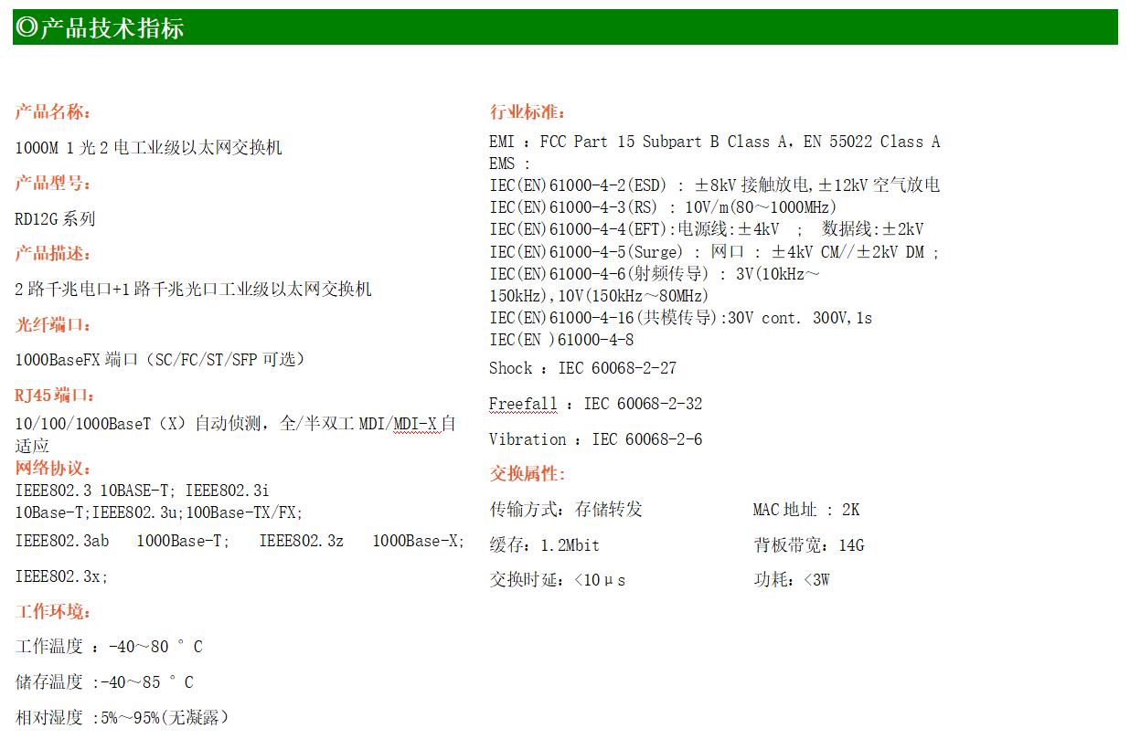 2路千兆電口+1路千兆FX光口工業(yè)級以太網(wǎng)交換機,支持2個100Base-T/1000Base-TX電口和1個1000Base-X光口。產(chǎn)品符合FCC、CE、ROHS標準。RD12G系列交換機具有-40℃~80℃的工作溫度,具有超強的堅固度能適應(yīng)各種嚴苛環(huán)境,也可以非常方便的安置在空間緊湊的控制箱中。導(dǎo)軌的安裝特性、寬溫操作及擁有IP40防護等級的外殼及LED指示燈,使YHD12G成為一個即插即用的工業(yè)級設(shè)備,為用戶的以太網(wǎng)設(shè)備聯(lián)網(wǎng)提供可靠、便捷的解決方案。