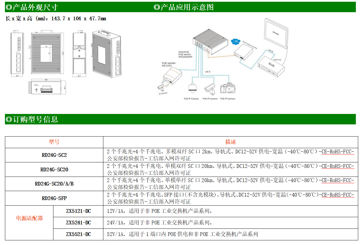4路千兆電口+2路千兆FX光口工業(yè)級(jí)以太網(wǎng)交換機(jī),支持4個(gè)100Base-T/1000Base-TX電口和2個(gè)1000Base-X光口。產(chǎn)品符合FCC、CE、ROHS標(biāo)準(zhǔn)。RD24G交換機(jī)具有-40℃~80℃的工作溫度,具有超強(qiáng)的堅(jiān)固度能適應(yīng)各種嚴(yán)苛環(huán)境,也可以非常方便的安置在空間緊湊的控制箱中。導(dǎo)軌的安裝特性、寬溫操作及擁有IP40防護(hù)等級(jí)的外殼及LED指示燈,使RD24G成為一個(gè)即插即用的工業(yè)級(jí)設(shè)備,為用戶的以太網(wǎng)設(shè)備聯(lián)網(wǎng)提供可靠、便捷的解決方案。