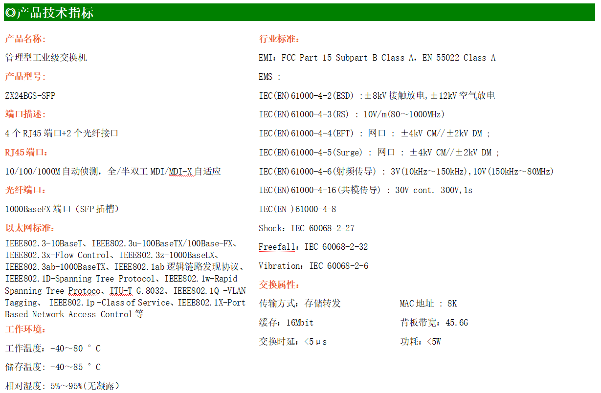 ZX24BGS-SFP是網(wǎng)管型工業(yè)以太網(wǎng)交換機(jī),產(chǎn)品符合FCC、CE、ROHS標(biāo)準(zhǔn)。支持2個(gè)千兆光口和4個(gè)千兆電口,支持一路console口;支持工業(yè)現(xiàn)場(chǎng)所需的以太網(wǎng)二層協(xié)議,保證通信網(wǎng)絡(luò)的穩(wěn)定性;該系列交換機(jī)采用低功耗、無風(fēng)扇設(shè)計(jì),確保無噪聲干擾,同時(shí)支持-40~85℃工作溫度和良好的EMC電磁兼容性能,保證在惡劣的工業(yè)環(huán)境中保持穩(wěn)定的工作,為工廠自動(dòng)化,智能交通,視頻監(jiān)控等工業(yè)應(yīng)用領(lǐng)域組建快速穩(wěn)定的網(wǎng)絡(luò)終端接入網(wǎng)絡(luò)提供安全可靠的解決方案。