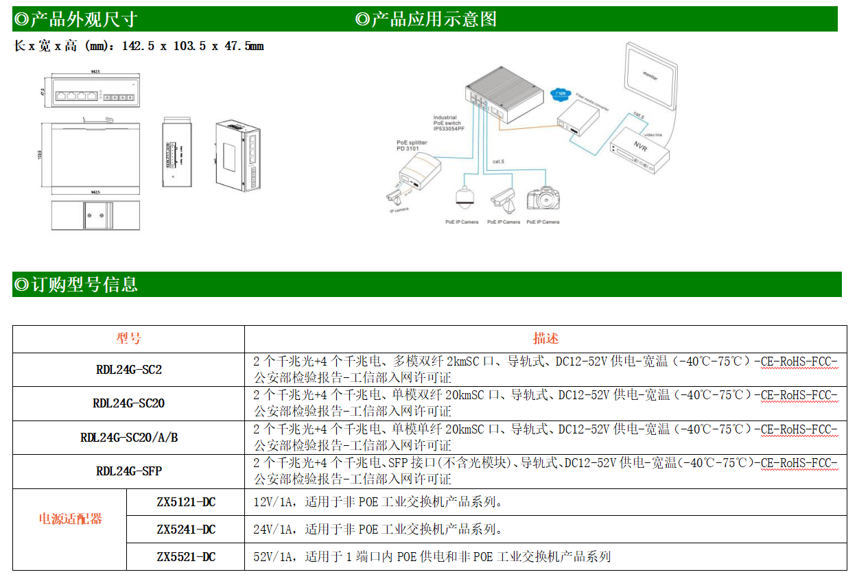 4路千兆電口+2路千兆FX光口工業級以太網交換機,支持4個100Base-T/1000Base-TX電口和2個1000Base-X光口。產品符合FCC、CE、ROHS標準。RDL24G交換機具有-40℃~75℃的工作溫度,具有超強的堅固度能適應各種嚴苛環境,也可以非常方便的安置在空間緊湊的控制箱中。導軌的安裝特性、寬溫操作及擁有IP40防護等級的外殼及LED指示燈,使RDL24G成為一個即插即用的工業級設備,為用戶的以太網設備聯網提供可靠、便捷的解決方案。