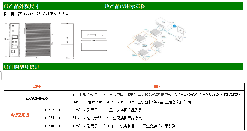 RD28GS-M是網管型工業以太網交換機,產品符合FCC、CE、RoHS標準。支持2個千兆光口和8個千兆電口;支持工業現場所需的以太網二層協議,保證通信網絡的穩定性;該系列交換機采用低功耗、無風扇設計,確保無噪聲干擾,同時支持-40~80℃工作溫度和良好的EMC電磁兼容性能,保證在惡劣的工業環境中保持穩定的工作,為工廠自動化,智能交通,視頻監控等工業應用領域組建快速穩定的網絡終端接入網絡提供安全可靠的解決方案。