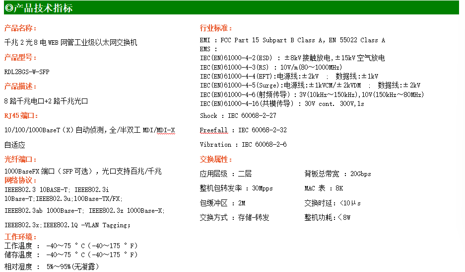 RDL28GS-W-SFP系列WEB網管工業級以太網交換機,產品符合FCC、CE、ROHS標準,支持工業現場所需的以太網二層協議,保證通信網絡的穩定性。該系列交換機采用低功耗、無風扇設計,確保無噪聲干擾,同時支持-40~75℃工作溫度和良好的EMC電磁兼容性能,保證在惡劣的工業環境中保持穩定的工作,為工廠自動化,智能交通,視頻監控等工業應用領域組建快速穩定的網絡終端接入網絡提供安全可靠的解決方案。