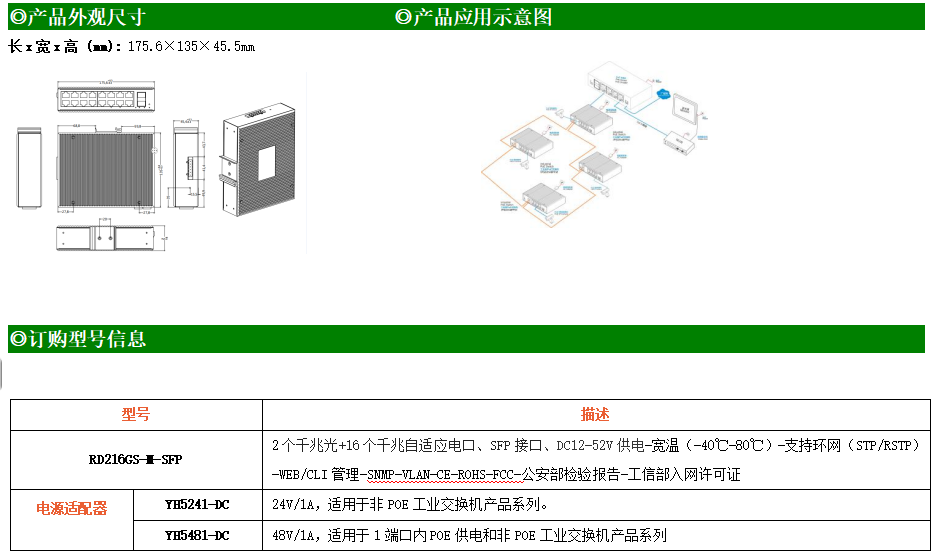 RD216GS-M是網管型工業以太網交換機,產品符合FCC、CE、RoHS標準。支持2個千兆光口和16個千兆電口;支持工業現場所需的以太網二層協議,保證通信網絡的穩定性;該系列交換機采用低功耗、無風扇設計,確保無噪聲干擾,同時支持-40~80℃工作溫度和良好的EMC電磁兼容性能,保證在惡劣的工業環境中保持穩定的工作,為工廠自動化,智能交通,視頻監控等工業應用領域組建快速穩定的網絡終端接入網絡提供安全可靠的解決方案。
