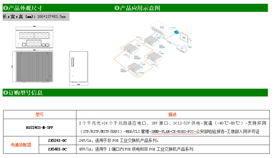 RD224GS-M-SFP是網(wǎng)管型工業(yè)以太網(wǎng)交換機(jī),產(chǎn)品符合FCC、CE、RoHS標(biāo)準(zhǔn)。支持2個(gè)千兆光口和24個(gè)千兆電口;支持工業(yè)現(xiàn)場(chǎng)所需的以太網(wǎng)二層協(xié)議,保證通信網(wǎng)絡(luò)的穩(wěn)定性;該系列交換機(jī)采用低功耗、無(wú)風(fēng)扇設(shè)計(jì),確保無(wú)噪聲干擾,同時(shí)支持-40~85℃工作溫度和良好的EMC電磁兼容性能,保證在惡劣的工業(yè)環(huán)境中保持穩(wěn)定的工作,為工廠自動(dòng)化,智能交通,視頻監(jiān)控等工業(yè)應(yīng)用領(lǐng)域組建快速穩(wěn)定的網(wǎng)絡(luò)終端接入網(wǎng)絡(luò)提供安全可靠的解決方案。