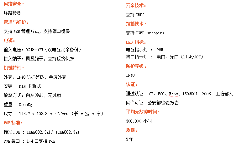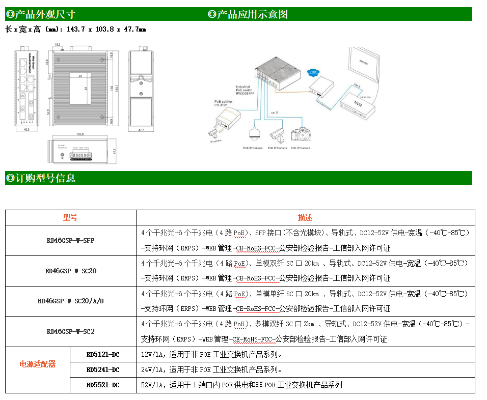 RD46GSP-W-SFP系列WEB網管工業級以太網交換機,產品符合FCC、CE、ROHS標準,支持工業現場所需的以太網二層協議,保證通信網絡的穩定性。該系列交換機采用低功耗、無風扇設計,確保無噪聲干擾,同時支持-40~85℃工作溫度和良好的EMC電磁兼容性能,保證在惡劣的工業環境中保持穩定的工作,為工廠自動化,智能交通,視頻監控等工業應用領域組建快速穩定的網絡終端接入網絡提供安全可靠的解決方案。