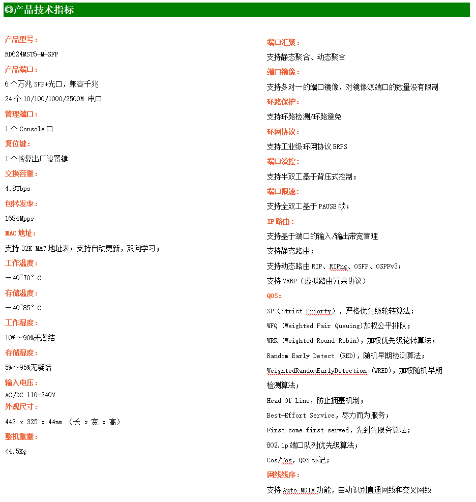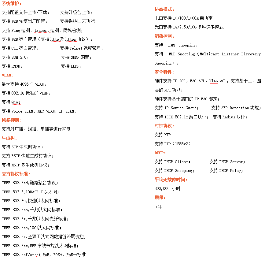 ●網(wǎng)絡(luò)冗余:支持STP/RSTP/MSTP,支持ERPS(自愈時間<20ms)