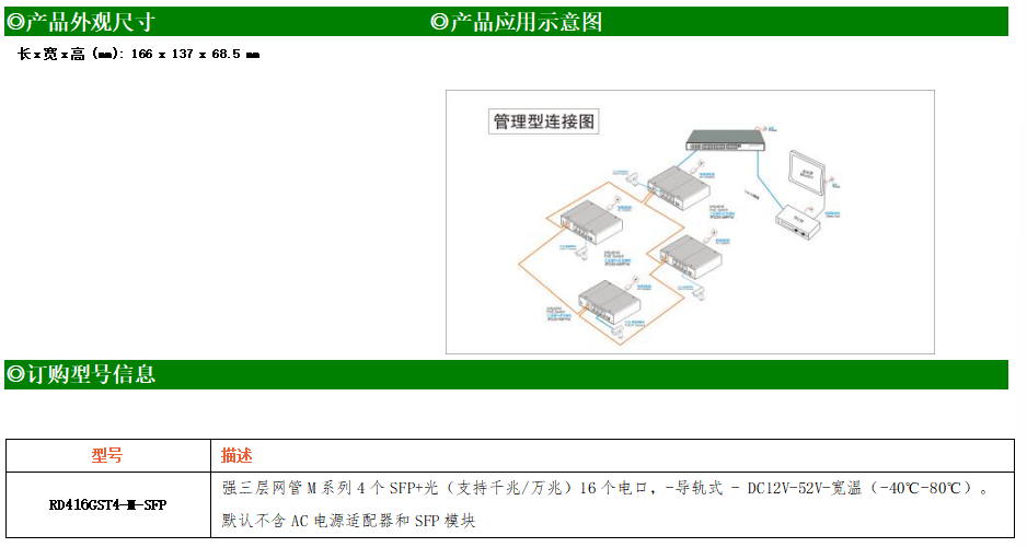 RD416GST4-M-SFP交換機是我司推出的一款萬兆三層交換機,配備4個萬兆SFP+光口和16個10/100/1000M Base-T自適應電口,具備先進的硬件處理能力和最豐富的業務特性。支持IPv4/IPv6 硬件雙棧及線速轉發,使客戶能夠從容應對即將帶來的IPv6 時代其提供高容量的交換能力。RD416GST4-M-SFP交換機具有-40℃~80℃的工作溫度,具有超強的堅固度能適應各種嚴苛環境。導軌式安裝特性、寬溫操作,使RD416GST4-M-SFP的交換機成為一個即插即用的工業級設備,為用戶的以太網設備聯網提供可靠、便捷的解決方案。